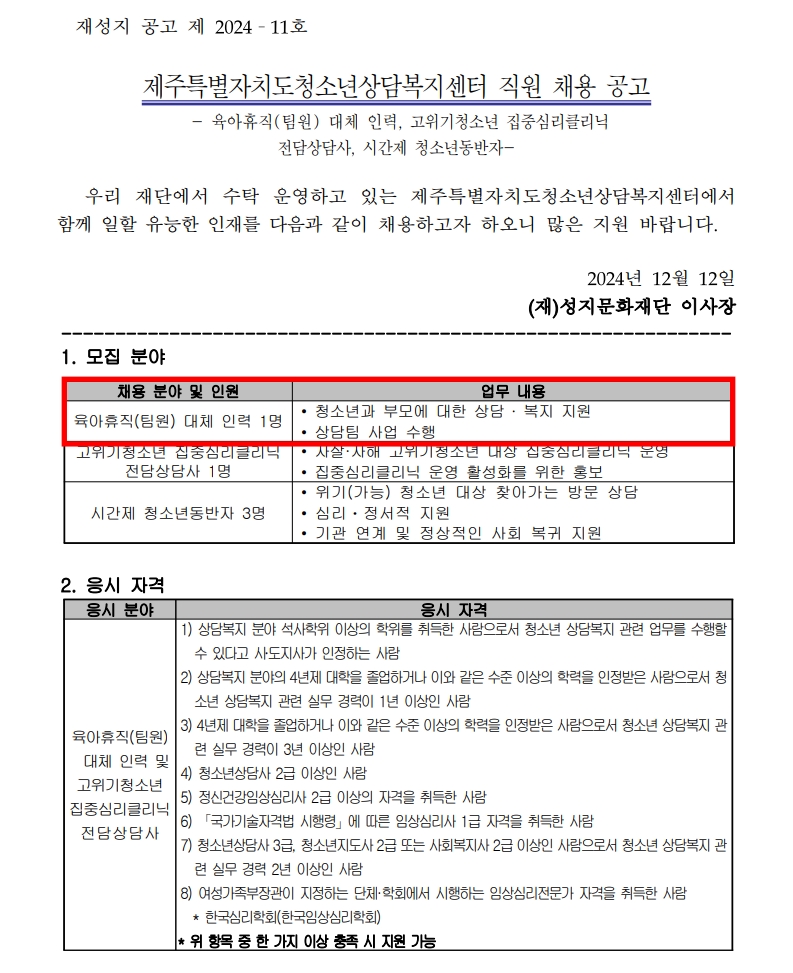 Á¦ÁÖÆ¯º°ÀÚÄ¡µµÃ»¼Ò³â»ó´ãº¹Áö¼¾ÅÍ Á÷¿ø ä¿ë °ø°í