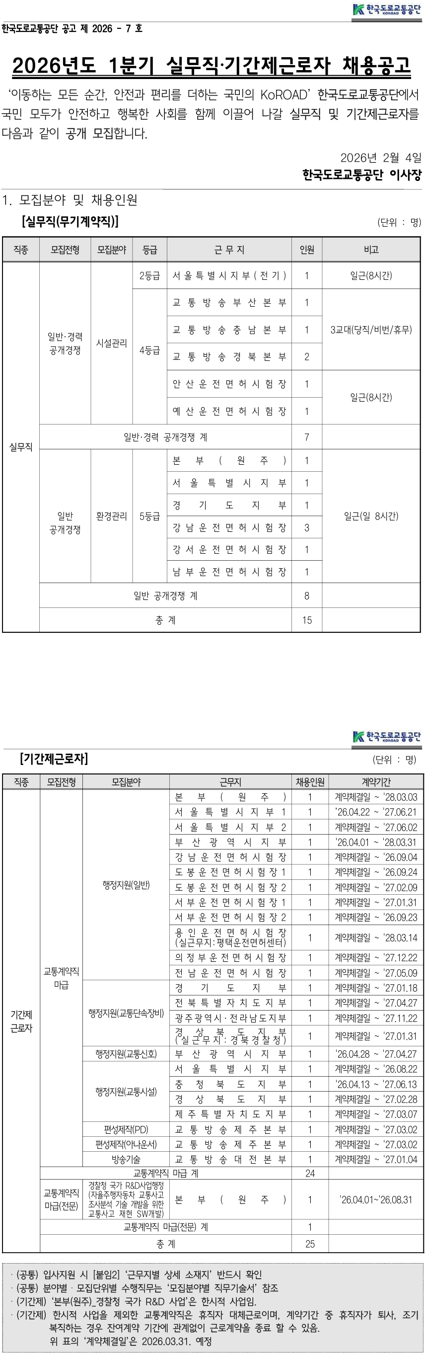 [Çѱ¹µµ·Î±³Åë°ø´Ü] 2026³âµµ 1ºÐ±â ½Ç¹«Á÷ ¹× ±â°£Á¦±Ù·ÎÀÚ Ã¤¿ë°ø°í